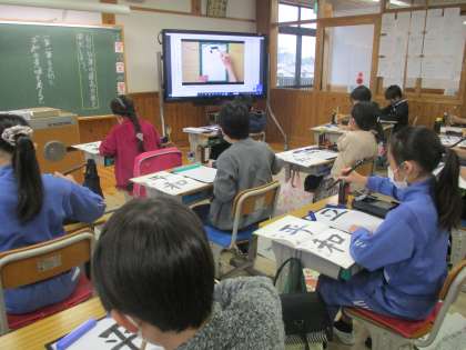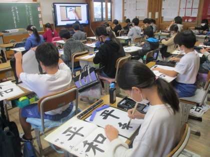 「平和」の二文字を、姿勢や筆の持ち方に気を付けるとともに、「平」の字は、横角の長さと方向に、「和」の字は、左右の組み立て方や左はらい、折れの方向、筆順と字形に気を付けて筆を動かしています。