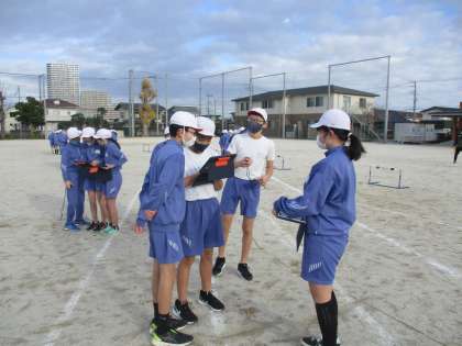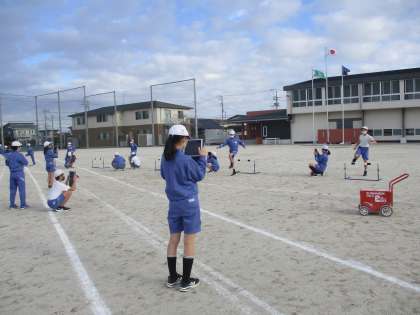 ハードルを跳び越すフォームの確認を、一人一台端末を活用して行っています。