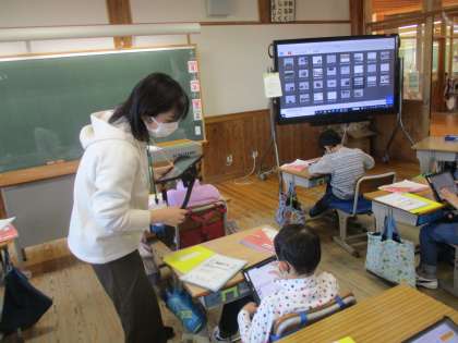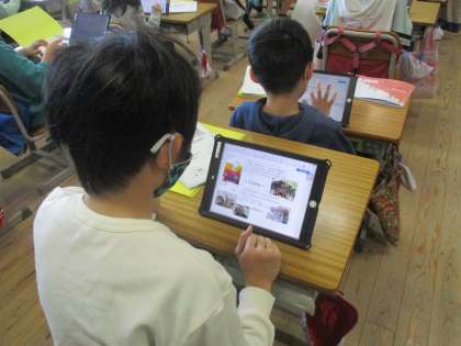 机上には一人一台端末が置かれ、子供たちは学習に取り組んでいます。