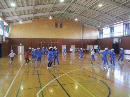 ウォーミングアップとグルーピングを兼ねて、ジョグやスキップをしながら楽しそうに体をほぐしています。