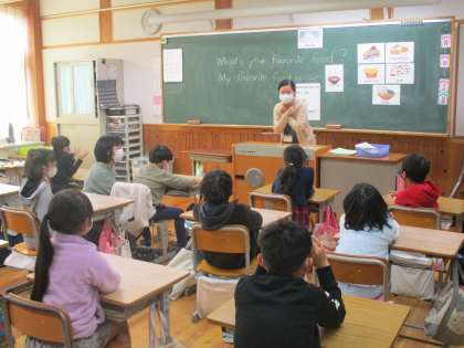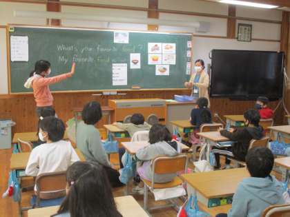 “What's your favorite food ? ”の問いに対し“My favorite food is 〜 .”と答えるスモールトークをALTと学級担任とで行いました。