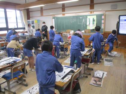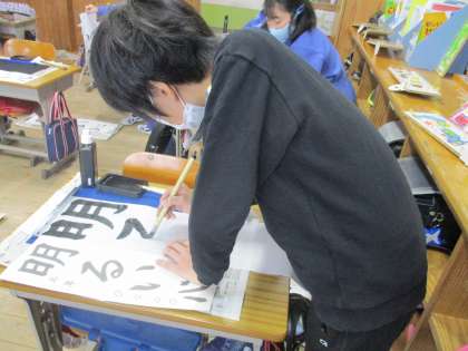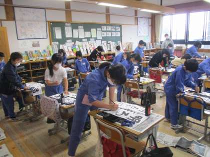 お手本をよく見ながら、集中して、一画一画丁寧に筆を動かす子供たち。