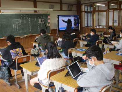 机上には、学習ノートではなく、一人一台端末が置かれ、学習が展開されています。