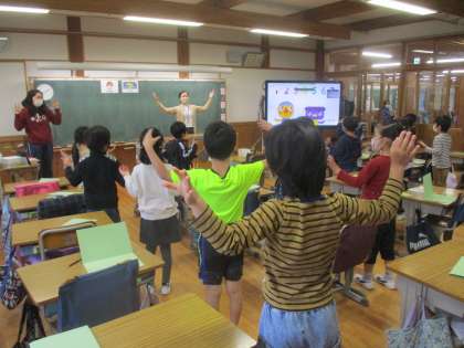 英語の数え歌で、1から10までの数字を英語で体を動かしながら楽しそうに歌う子供たち。