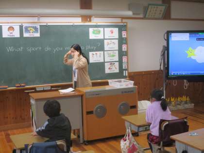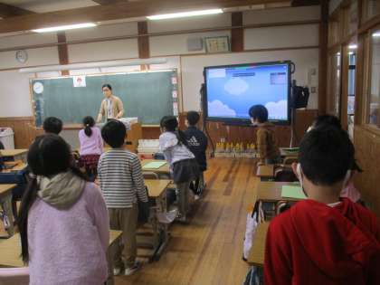 ALTに英語で天気を問われると、英語で答える子供たち。