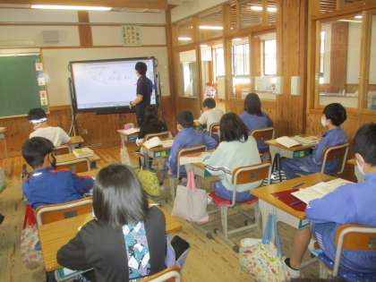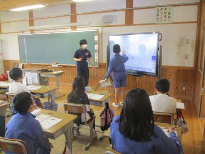 先生は、デジタル黒板を使って、問題を投げかけたり、子供たちの考えを導き出したりしています。