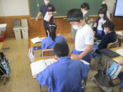 難しい問題にあたったとき「教えて」と友達に話しかけ、「いいよ」と困っている子に考え方を説明する子供たち。