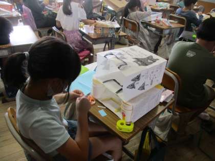 「ふくろ」を用意し、「お城の中へ」「宇宙の世界」「お花畑」「虫たちのマンション」「夢のテレビ局」「海の中」等々、自分が想像した自分だけの素敵な世界を「ふくろ」の中につくる子供たち。