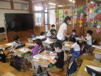 子供たちの机上にあるのは、観察カードと1人1台端末です。