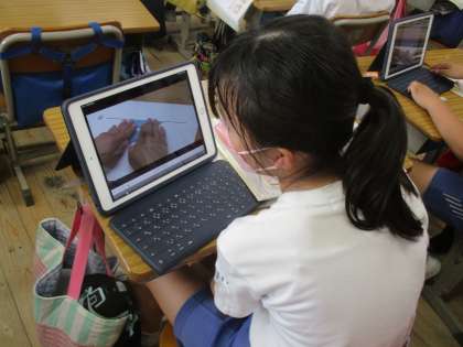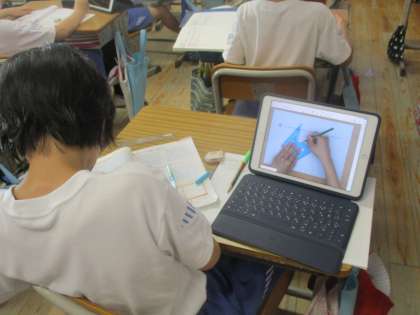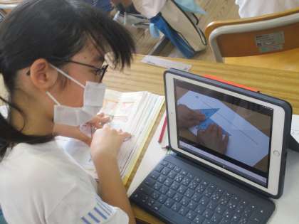 1人1台端末に先生が用意してくれた平行な線のかき方動画を活用しながら、2つの三角定規を使って平行な線をかく子供たち。