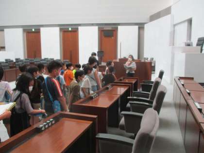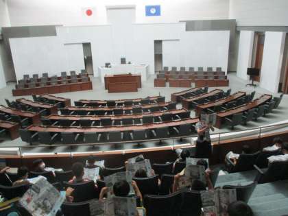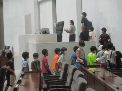 初めに、傍聴席に座って、実際に議会を行う場所を見渡しながら説明を聴く子供たち。