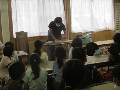 大津晃窯さんの方の作り方の説明を聴く子供たち。
