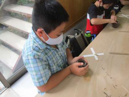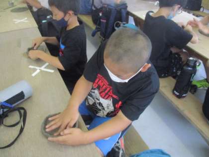聴いた説明と学校で練ったイメージを重ね合わせて、土粘土をこねる子供たち。