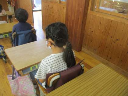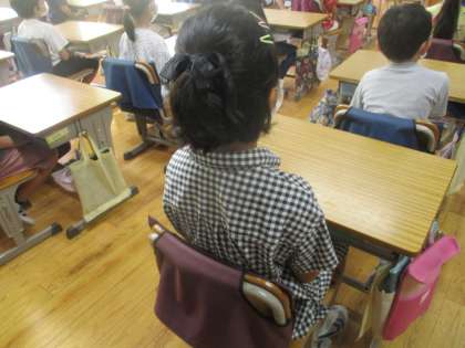 守小恒例「朝のビシッとタイム」の放送が流れると、背筋を伸ばし、心と身体を整え「ビシッと」する2年生。