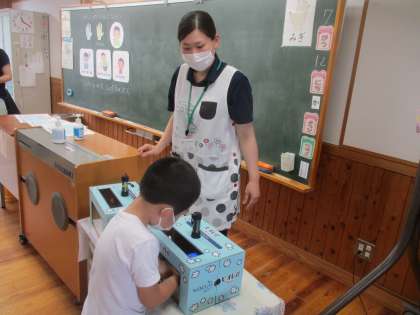 箱の中に手を入れると、目には見えない汚れが確認でき、自分の手の汚れ方について驚きを隠せない子供たちの姿が印象的でした。