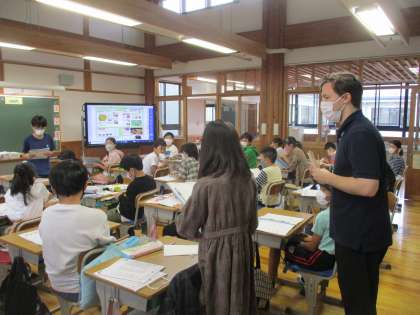 5年生のALTと楽しそうに学習する外国語の授業風景です。