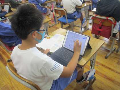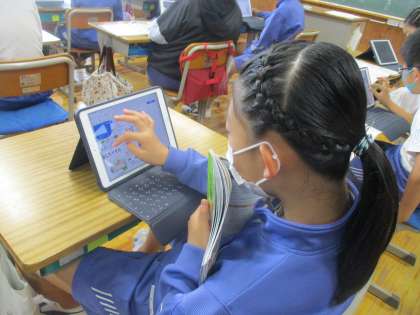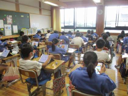5年生の教室の横を通ると、一人一人の机上に1人1台端末が。