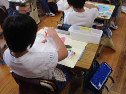 世界にたった一つしか無い、自分だけの世界の想像を膨らませる中で、楽しそうに水彩絵の具で画用紙に色を付ける子供たちの姿がとても印象的でした。