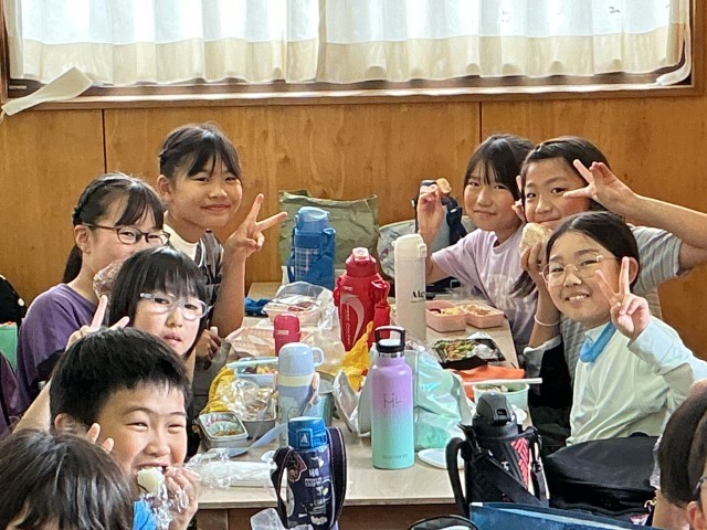 お家の方が朝早くから作ってくれたお弁当をニコニコしながら食べています!