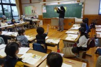資料「はしのうえのおおかみ」をもとに思いやり・親切についてみんなで考える1年生。先生の話に落ち着いてしっかりと耳を傾けています。