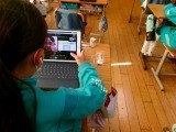 タブレットの向こうの先生と自分のペースで会話を楽しんでいます。