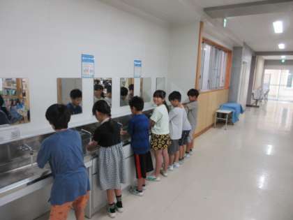 【下】毛筆が終わって、皆できちんと手洗いをしています。