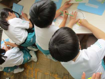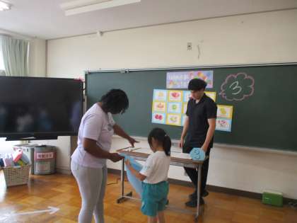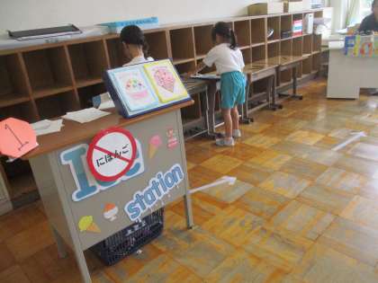 日本語×のお約束のもと、1、2年生がニコニコ笑顔で英語専科教師やALTに話しかけ、世界に一つだけのお気に入りのアイスをつくりました!
