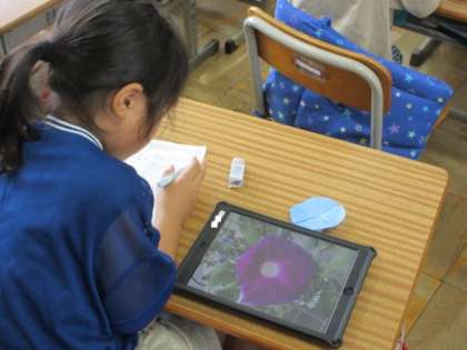 【中・下】みんなで大切に育てたあさがおが咲きました。