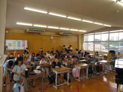【中】普段は使用しない音楽室に入り、「きれいだね」「涼しいね」との声が