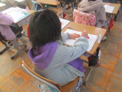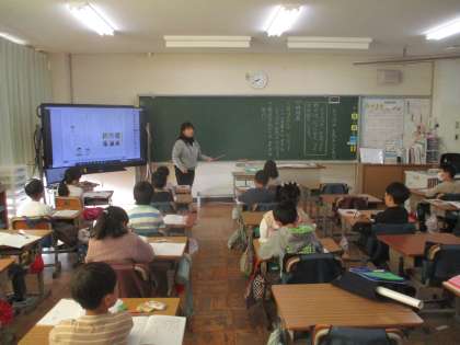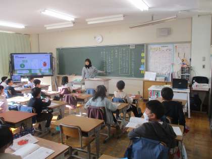 2年生の教室の横を通ると、丁寧な板書と先生の話をしっかりと聴く子供たちの姿が。