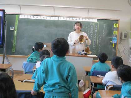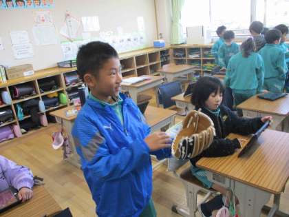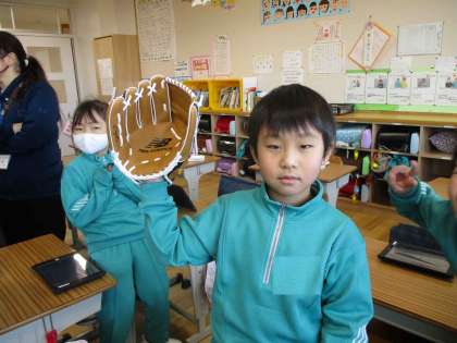 黒内小では、子供たちにそのグローブを見たり触ったりしてもらっています。