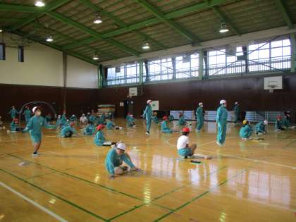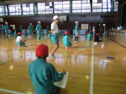 画像は、6年生が体育館で時間跳びをしている様子です。少しでも記録を伸びるようリズムをうまくとっています。