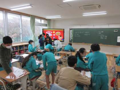 「What's the best ○○?」ALTの先生と発表の練習をしています。
