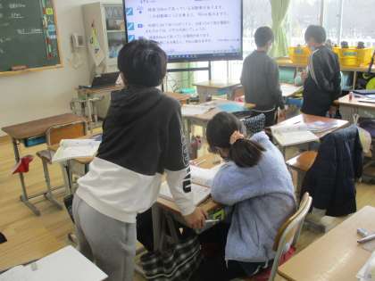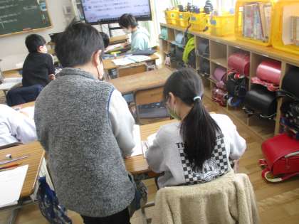5年生の教室の横を通ると、友達と一緒に話し合っている姿が。