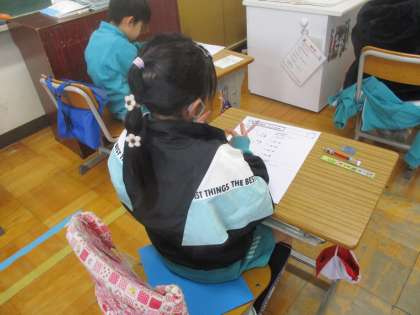 何をしているのだろうと教室に入ってみると、この1年間で学んだ算数の学習内容を確かめるテストを行っていました。
