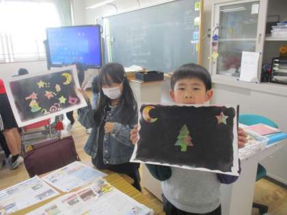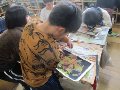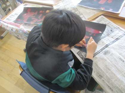 何をしているのだろうと教室に入ってみると、一人一人が「いっぱいうつして」の作品の仕上げを一生懸命行っていました。