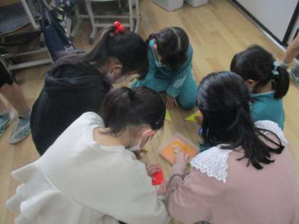 1年生が生活の学習で学んだけん玉やお手玉、折り紙などで笑顔いっぱい楽しむ子供たちの姿がとても微笑ましい一コマでした。