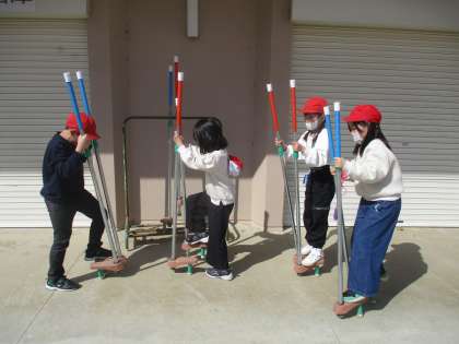 竹馬に友達と挑戦する子供たち。