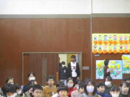 【中】【下】5年生が見守る中、立派な態度で6年生が会場へ入場しています