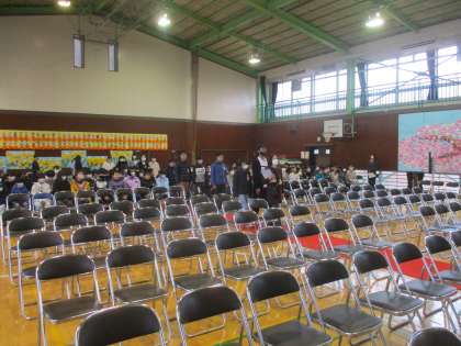 【上】昨日、つくり上げた会場で6年生の入場を待つ5年生