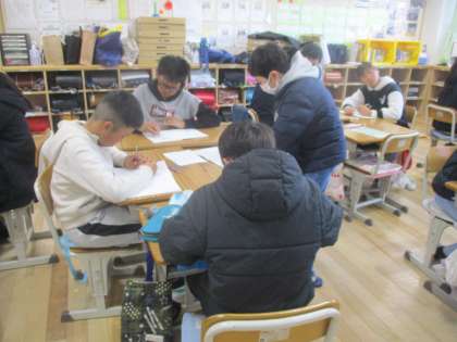6年生の教室の横を通ると、グループで楽しそうに活動する姿がみえました。