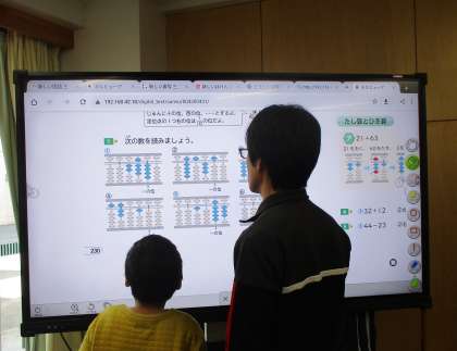 電子黒板で、そろばんでの計算方法を確認しなが学習をすすめています。