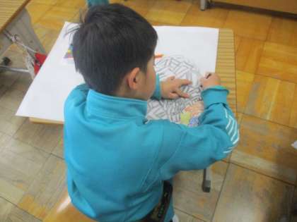 何をしているのだろうと教室の中に入ってみると、自分の作品バッグや4月に入ってくる新しい1年生へのプレゼントに丁寧に絵を描く1年生。