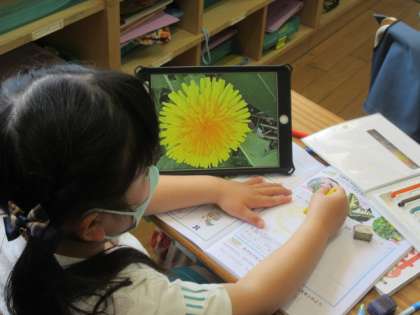 校庭で見つけた生きものをiPadで撮影し、それをスケッチしています。