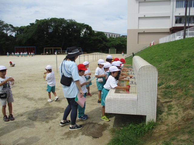 生活科「夏となかよし」では、ペットボトルやマヨネーズ等の容器を使って水遊び!