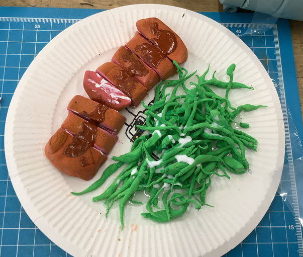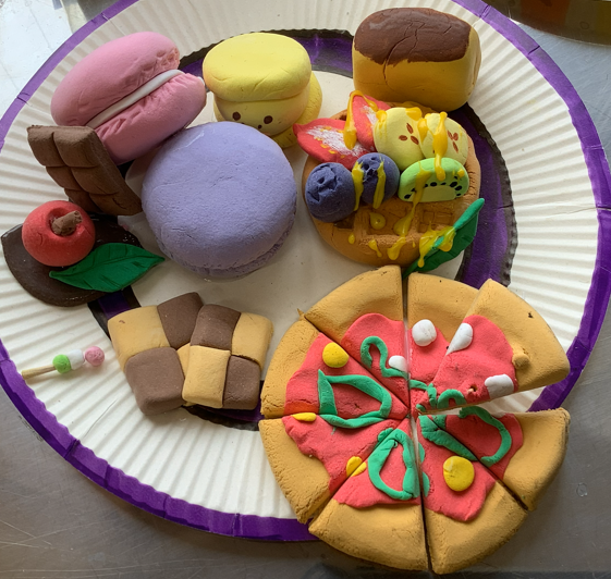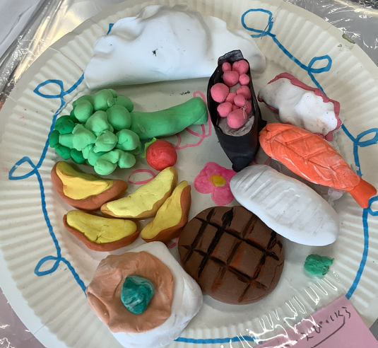 5年生の図工でグルメ粘土レストランに向けて作品が整いつつあります。