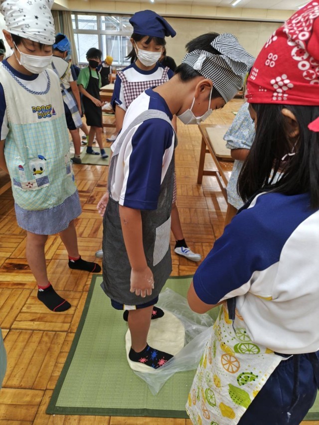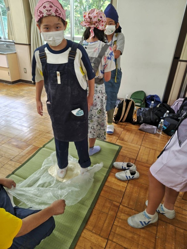 先生の説明をよく聞きながら、小麦粉を大きな塊になるまでこねました。次は、いよいよ足踏みです。体重をかけ、生地の弾力を感じながら、コシのあるうどんを作っていきます。