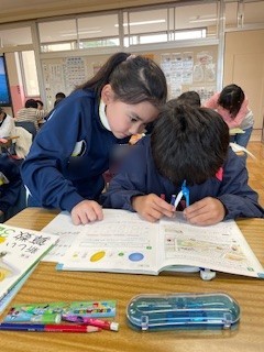 まっすぐな線と、折れ曲がった線の長さを調べていく過程で、コンパスで長さを写し取ることができることを学ぶ学習でした。一人で考える子、みんなで考える子、それぞれのペースに合わせて学習を進めています。