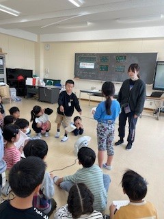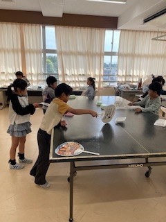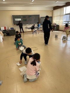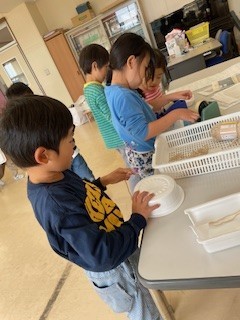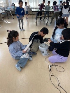 食品トレイを切ってうちわやサーキュレーターで風を送るとフワフワ、ピョンピョン、スーッといろいろな動きをします。「なににみえるかな?」先生の声かけに車、クラゲ、鳥・・・と子どもたちの発想は豊か。その動きから作るものを考えて作品を仕上げる予定です。