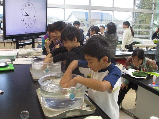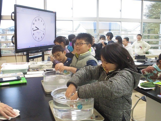 今日がこの学習の最初ということで、ふたがしてある空のペットボトルの容器を氷水とお湯に入れ、様子を確認しました。